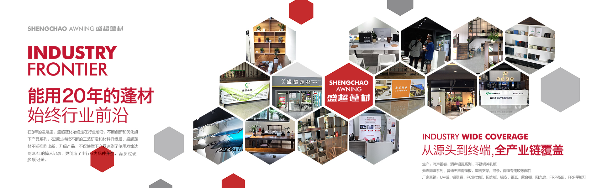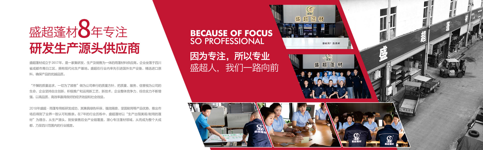 盛超蓬材是由四川超諾商貿(mào)有限公司創(chuàng)辦,是一家集研發(fā)、生產(chǎn)、銷(xiāo)售和服務(wù)于一體的專(zhuān)業(yè)雨蓬供應(yīng)商。主要產(chǎn)品:實(shí)心耐力板,中空陽(yáng)光板、多層板、蜂窩板、鋁瓦、消聲鋁瓦、不銹鋼消聲等材料的雨蓬產(chǎn)品。自主研發(fā)多款雨蓬,擁有自己的專(zhuān)利和檢測(cè)報(bào)告。其中明星產(chǎn)品新型組裝式雨蓬,擁有組裝簡(jiǎn)便,美觀(guān)耐用、抗噪音,性?xún)r(jià)比高等優(yōu)勢(shì),多項(xiàng)檢測(cè)指標(biāo)領(lǐng)跑同行業(yè)。受到了市場(chǎng)和經(jīng)銷(xiāo)商的高度認(rèn)可。 公司自成立至今,從銷(xiāo)售到研發(fā)再到生產(chǎn),已經(jīng)過(guò)了3次跨越式的發(fā)展。2017年已成為四川雨蓬行業(yè)內(nèi)庫(kù)房面積大,員工多的一家公司。產(chǎn)值每年以平均20%的速度快速增長(zhǎng)??梢哉f(shuō)客戶(hù)是我們的老師,和他們合作使我們得到很多的學(xué)習(xí)機(jī)會(huì)來(lái)提高自身的技術(shù)水平和管理水平,是我們生產(chǎn)和發(fā)展的動(dòng)力。